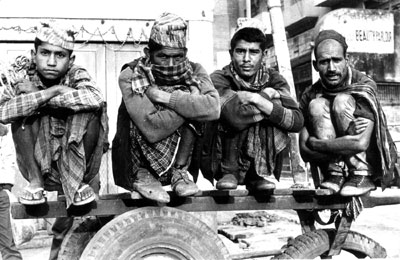who barefoot bent and weary waits,